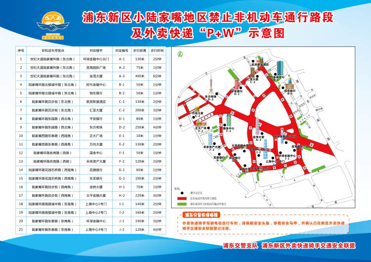小陆家嘴“禁非”区域内禁止非机动车驶入,如何解决小陆家嘴区域内白领员工外卖需求?面对城市交通管理新挑战,浦东公安分局交警支队在提升日常管理力度的基础上,变堵为疏,依托外卖骑手交通安全联盟,与外卖企业积极沟通,警企合作,通过推出“P(停车)+W(步行)”配送新模式,着力解决核心区域外卖配送痛点。