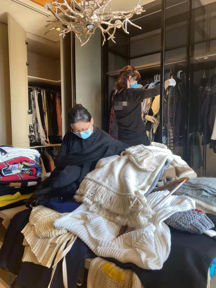 在古北壹号,一套四百多平米的别墅里,真真一行6个人在这里工作了1整天,五十多平的衣帽间里,上千件衣服被重新整理整齐排列;在绿城黄浦湾,一套两百多平米的大平层里,6个人一起做了3天,光袜子就整理出240多双;在苏州一户酒店老板家,她们整理了2千多件戏服,这些都是票友老板的日常穿搭……很多时候,这类业务都是客户相互介绍来的。