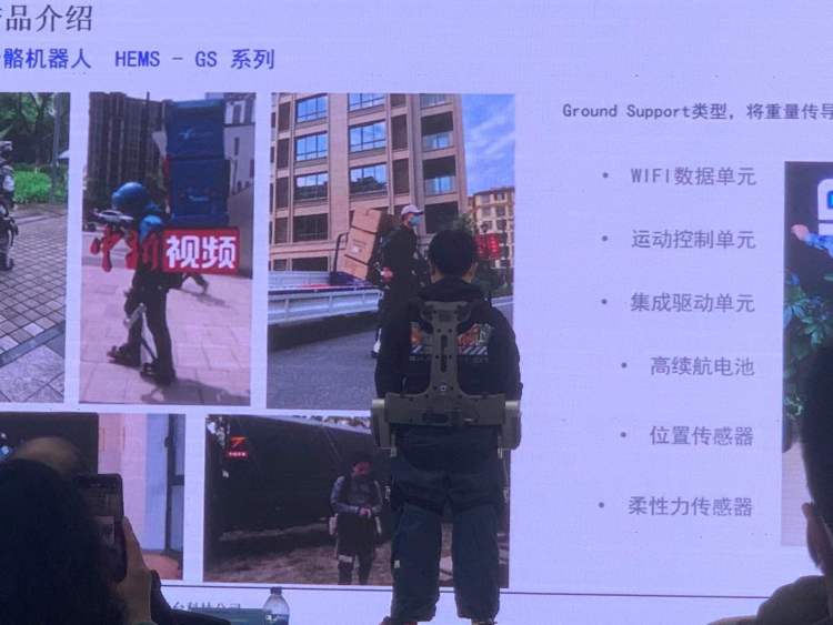 上海傲鲨智能科技有限公司市场总监张华上台进行技术项目发布时,还让一位同事穿上了一身“外骨骼”装备共同进行展示。大屏幕上“合作需求”一栏上,则注明了“市场开发”。