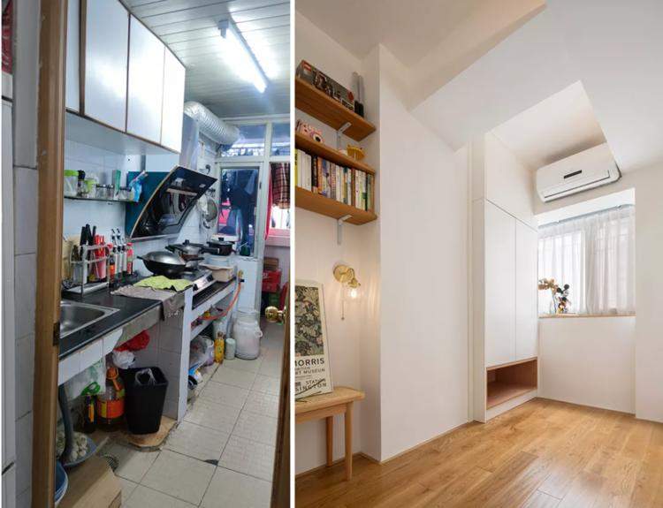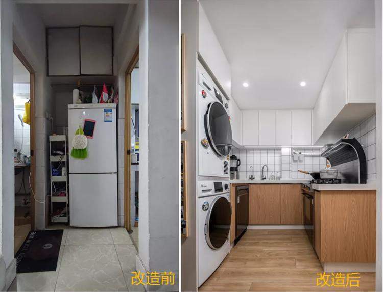左边图片是改造前,当时是家中的一个小过道,设计师认为这个空间其实属于浪费的空间,于是把这个区域纳入开放式厨房,改造后,厨房的长度为214cm,深203cm,并且嵌入了洗碗机、集成灶、洗衣机烘干机等电器。