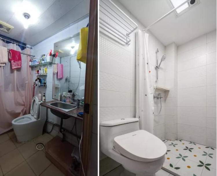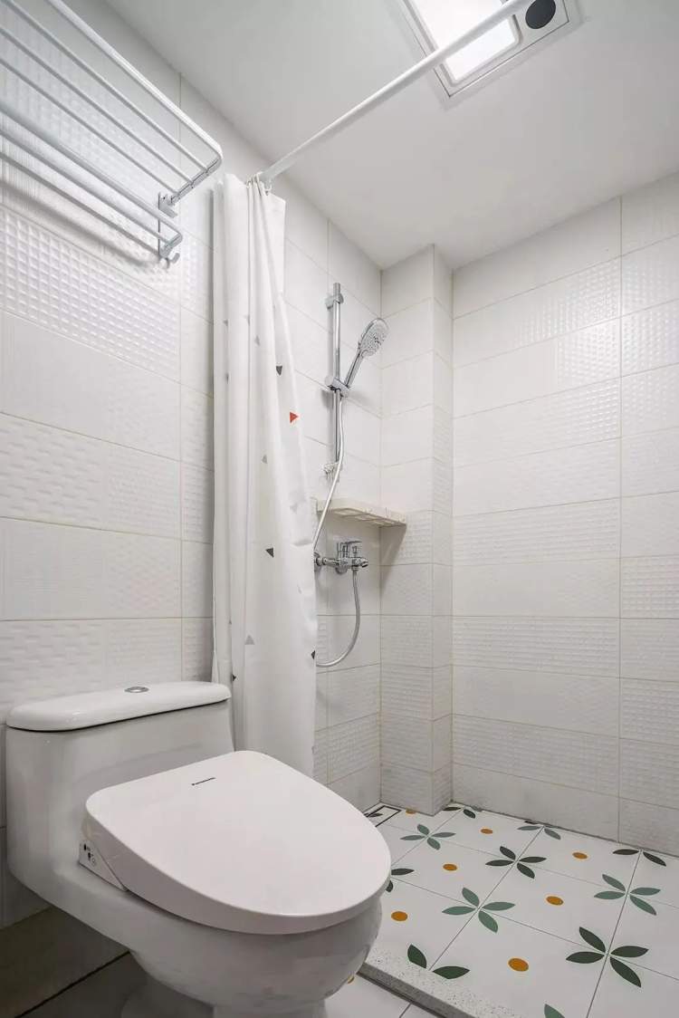 卫生间墙体做S墙设计后,扩大了面积,做嵌入式洗手台,对面是马桶区,淋浴区用浴帘做干湿分离。
