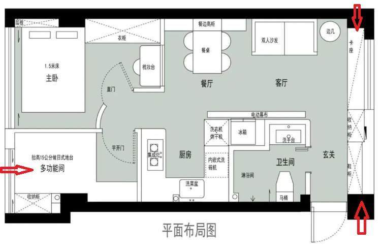 左图为改造前,是原户型的厨房,宽度为131cm,往主卧压缩19cm,多功能房宽度扩宽到150cm,正好是一张常规双人床垫的的宽度。