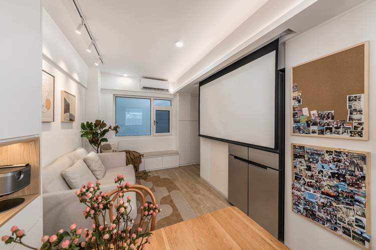 电视墙做S墙设计,客厅一面将冰箱嵌入,做投影幕布,另一面是洗手台,空间一点也不浪费。