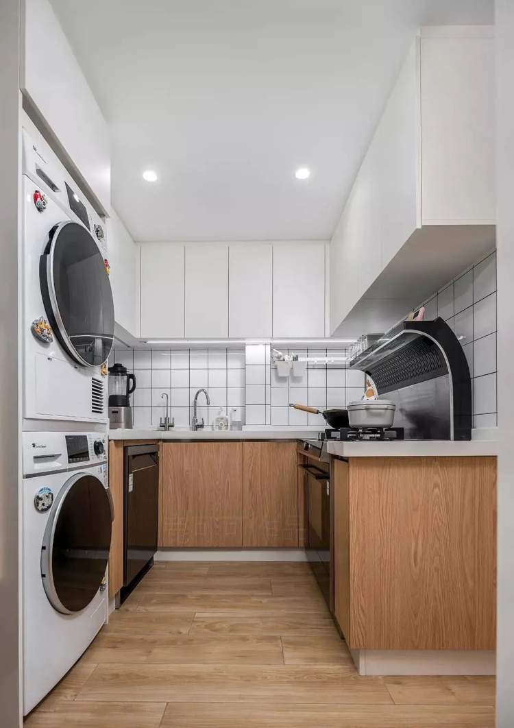 ■厨房墙面用了经典的白格子砖,U字形开放式厨房 ,洗烘一体机及洗碗机嵌入橱柜,遵循厨房黄金使用动线冰箱拿—洗—切—炒的动线。