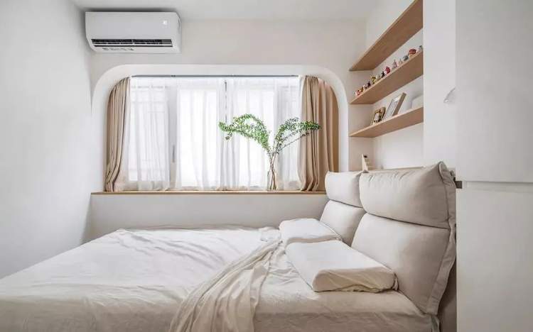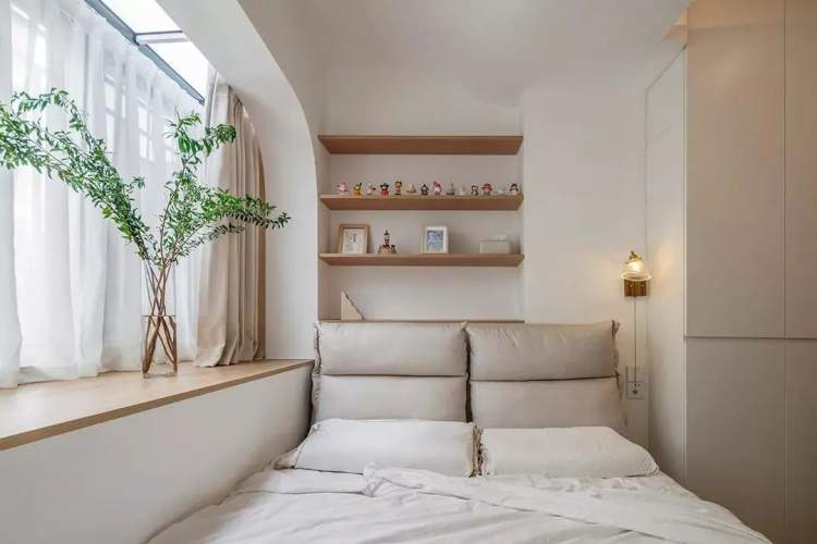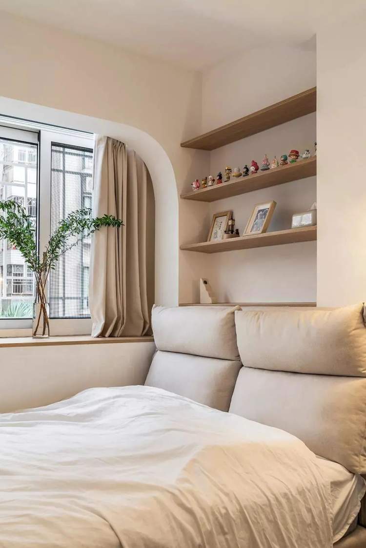 主卧整体奶呼呼的日式原木风,床的正上方有一条大梁,设计上做了弧形小波浪造型处理,很好地修饰了大梁,层高也不受影响。