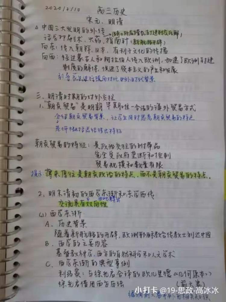 听课笔记的形式也不局限于电子版,钟爱手写且善于排版的同学们也展现了他们的创意,手写体的听课笔记在们中颇受欢迎。如2019级思想政治教育专业的高冰冰同学的高三历史笔记,除了有好看的排版、突出的重点,还有便利贴上的感想反思。