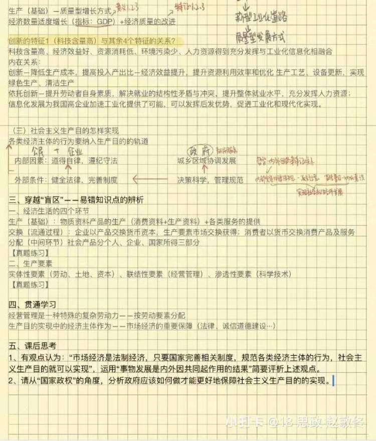 如2018级思想政治教育专业的赵敏佟同学的笔记,以流程图的方式梳理了经济生活四环节的基础内容,整理了课程的知识重难点和易错点进行强调和辨析,最后进行知识贯通和反思总结。整份笔记较为完整地呈现了整堂课的内容和流程,并以批注的形式点明课程开展的明暗线,布局清爽且内容丰富,是很好的笔记体范本。