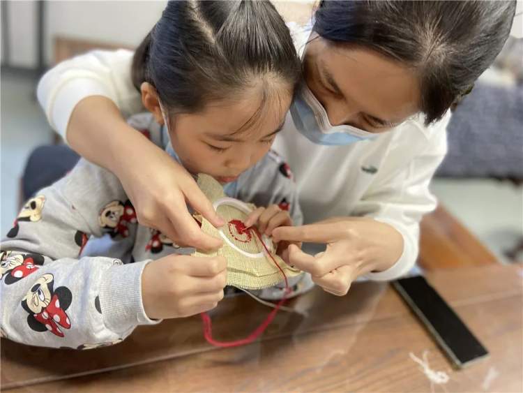 在针线穿梭中,五星红旗的徽章跃然在绷架上,拿着来之不易的成果,家长和孩子的成就感溢于言表。