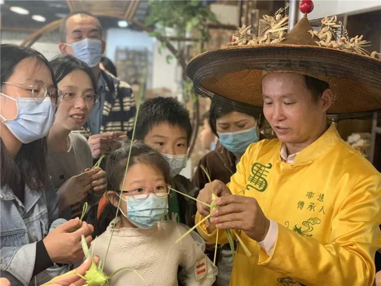 在造纸印刷体验馆,棕编艺术的非遗传人马群,带领大家一起用棕榈树叶编织生动的艺术造型。棕编是中华民族传统手工技艺之一,是以棕榈树叶为原料编制的工艺品。在穿、插、剪、折中,一个个惟妙惟肖的棕编小蚂蚱就诞生了。