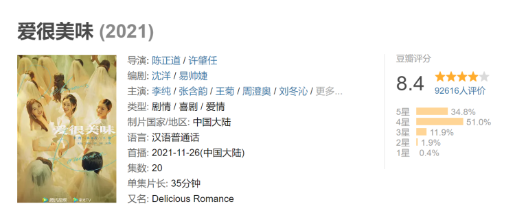 当然,如果我们将视线放得更远一些,不难发现,在外界普遍迷信大成本、大制作的背景下,2021年的网剧市场实际涌现出多部像《爱很美味》这样“小而美”的作品。它们都曾遭遇同类题材扎堆的难题,但最终还是以巧思、以新意,赢得了观众的肯定。