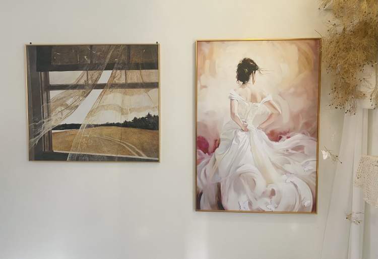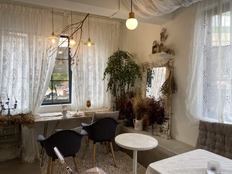 最出彩的还是二楼啦。玫瑰干花枝、蒲公英吊饰、白色蕾丝和烛台、复古相框、松果松枝摆台、各色油画……各种小心思的创意,让整个小店充满了西式复古风情。