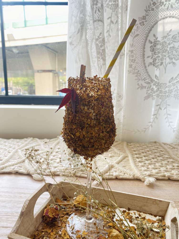 碾碎的黄玫瑰干花瓣装饰在玻璃杯上,让这杯南瓜热饮也显得格外不同了↓