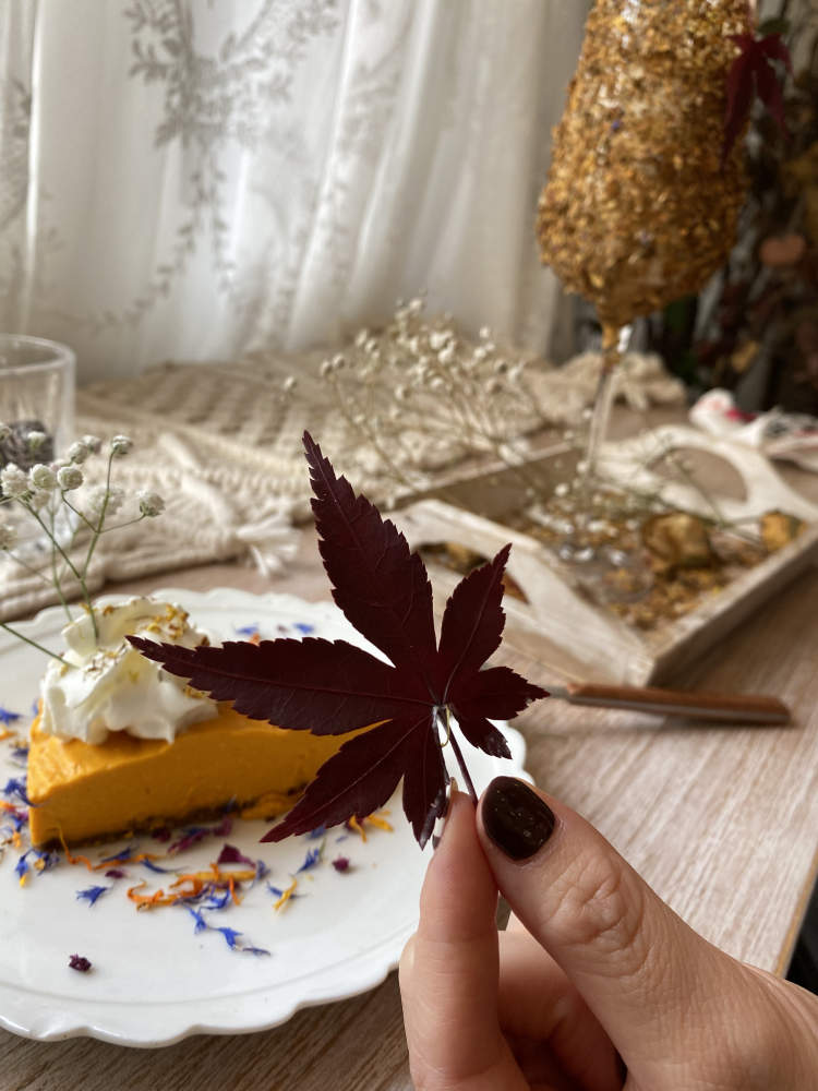 南瓜蛋糕主要成分是南瓜泥,蛋糕底则是碎坚果做成的,装饰着白色奶油、深红色枫叶和一些碎花瓣,又是秋冬入画的感觉。