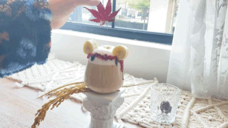 撒娇其实是加了咖啡、牛奶、巧克力、香蕉的饮品。店员端上桌的时候,这款饮品的造型让周到君眼前一亮。香蕉片就像泰迪熊耳朵似的,杯沿上的挂壁则是草莓果干碾碎后用巧克力粘上的。