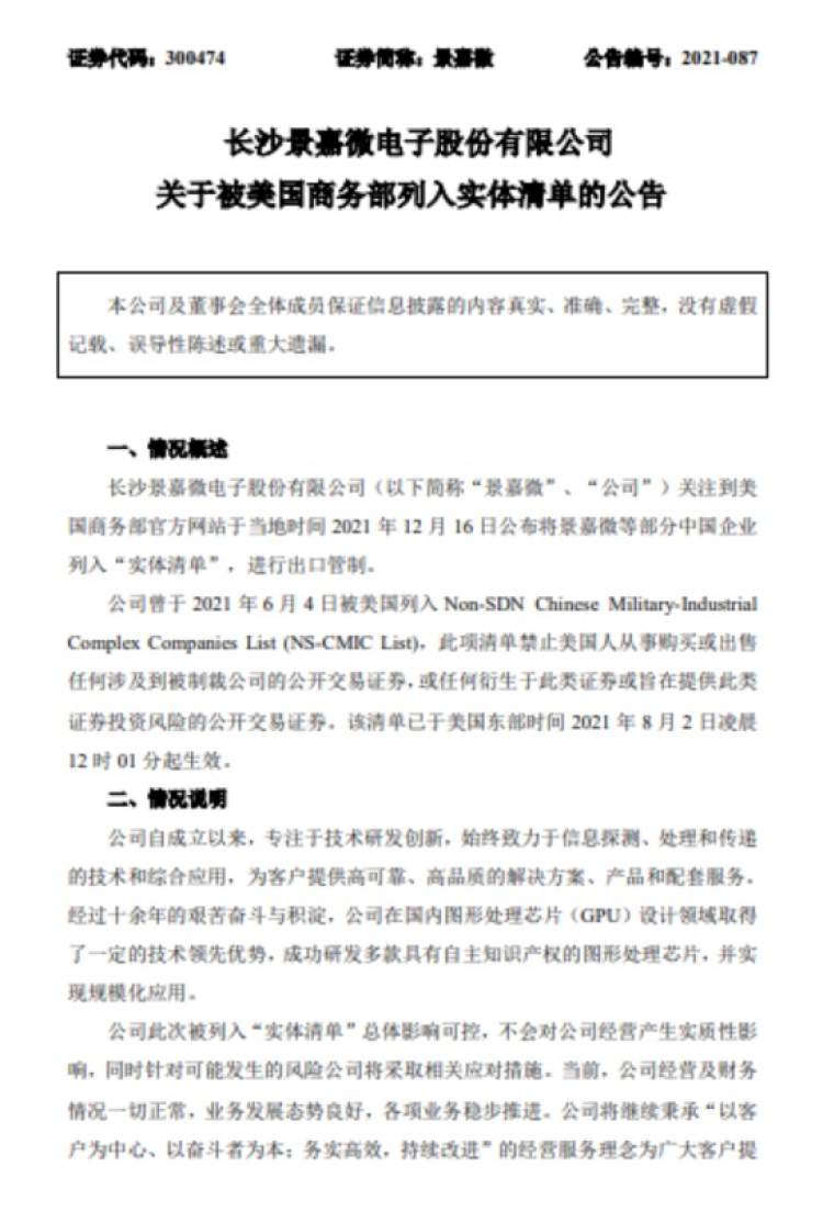 12月17日晚间,景嘉微公告回应被美国商务部列入实体清单:公司自成立以来,专注于技术研发创新,始终致力于信息探测、处理和传递的技术和综合应用,为客户提供高可靠、高品质的解决方案、产品和配套服务。经过十余年的艰苦奋斗与积淀,公司在国内图形处理芯片(GPU)设计领域取得了一定的技术领先优势,成功研发多款具有自主知识产权的图形处理芯片,并实现规模化应用。公司此次被列入“实体清单”总体影响可控,不会对公司经营产生实质性影响,同时针对可能发生的风险公司将采取相关应对措施。