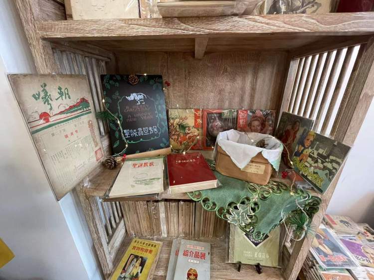 除了回忆,店里也有“潮流”。店主专门辟出了一个“专柜”放了和圣诞节相关的书和明信片,还用小灯泡点缀,晚上开了灯一定如梦似幻。店主说,因为圣诞节快到了,整理书时又发现很多相似主题的,就干脆放一起展示了。