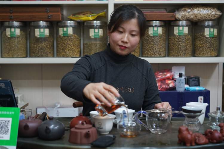 35岁的刘亚楠是2005年市场建立之初进驻的茶商,做茶叶生意已有16年了。当年,她还是个小姑娘,跟着哥哥学做茶叶生意,一开始并不适应,觉得一辈子就守着几平米的茶铺,心有不甘。现在,却也把生意打理得颇有特色,并在上海扎下根来,一家人幸福地生活在一起。刘亚楠的茶铺以养生茶为特色,讲究中草药与茶的结合,累积了一批热爱养生的老客户。