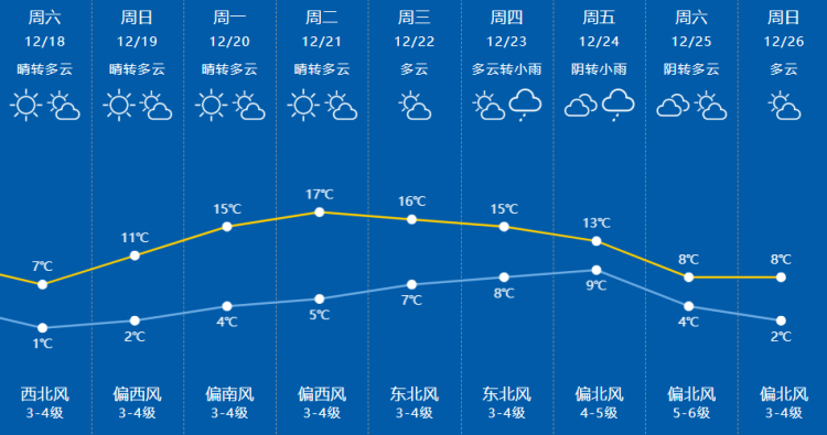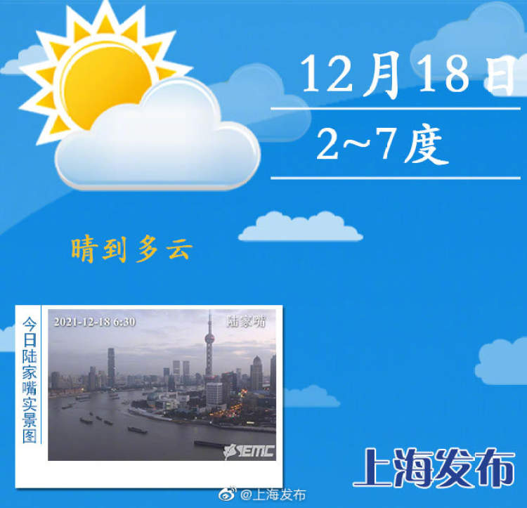 最低-2℃!晴冷的周末,申城迎来下半年来最冷一天 周到君 2021-12-18 来源:周到上海 又是一个晴冷的周末! 今天申城晴到多云,受冷空气影响,上海今天维持晴到多云的天气。 早晨气温再创新低,市区徐家汇1℃附近,郊区在零下2℃~2℃之间,有薄冰,局部地区有冰冻。 白天虽有阳光相伴,但是升温乏力,预计最高气温仅有7℃上下,也是今年下半年以来最冷的一天。 今天夜里到明天偏西风,风力都是3-4级。气温骤降,周到君提醒市民朋友做好防寒保暖。 经历过下半年最冷一天之后,明天起气温稍有回升,但最低温度都在10℃以下徘徊,下周二最高温度可达17℃。 寒潮来了,入冬还会远吗? 来源:周到上海 作者:周到君 赞一个 (0)