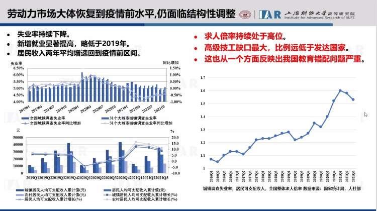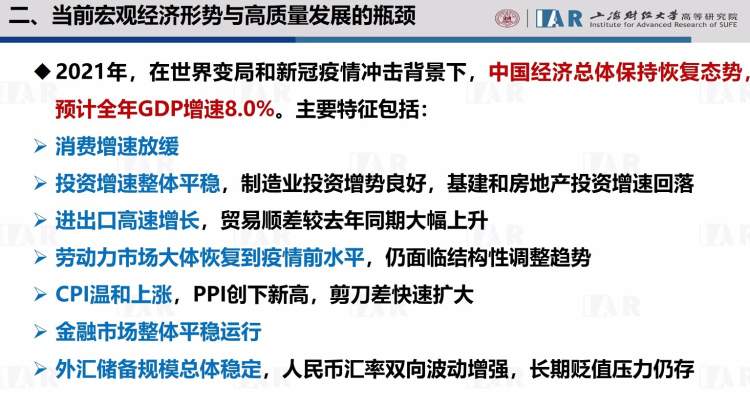 12月17日,上海财经大学高等研究院“中国宏观经济形势分析与预测”课题组发布《中国宏观经济形势分析与预测年度报告(2021-2022)》。课题组总负责人田国强教授介绍,此次报告新增加教育板块、环境与高质量发展板块,并在进一步扩充和完善中,为政府决策提供依据。他认为,要破解我国经济发展面对的需求收缩、供给冲击、预期转弱“三重压力”,落实稳中求进和推动高质量发展,实现创新驱动,必须坚持以经济建设为中心,处理好短期政策应对和中长期改革治理、一般性和特殊性、规律性和特色性以及市场化改革和加强管制的改革这四大辩证关系。