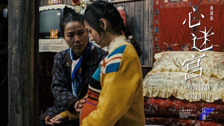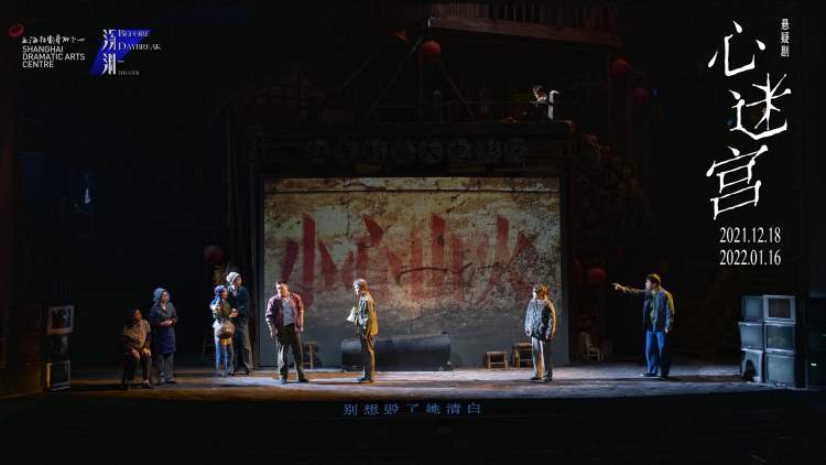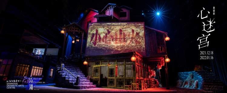 大幕拉开,两位话剧演员从环形台阶走下,伴随着他们的步伐,12米贵州吊脚楼出现在了观众眼前。一起命案在舞台右侧的水池突发,而在左侧,不同寻常的村民正观察着这些事。命案发生后,撑满舞台的电影幕布缓缓降下,一支片头曲点燃了这场年末舞台悬疑巨制《心迷宫》的现场。