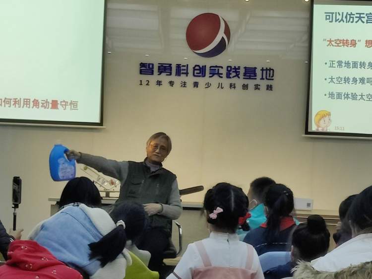 整个科普讲座的一个多小时时间里,72岁的她蹦高、旋转、举水桶,尽管有些头晕气喘,但能把复杂的重力现象生动地讲给孩子们听,总是笑得很开心。