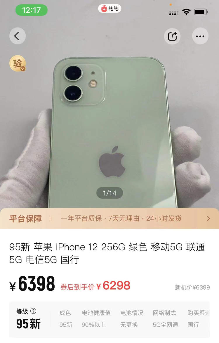 2021年5月,在一款“转转APP”上,小羽的男朋友看到了这台绿色的苹果12手机。当时,这台手机的标价为6398元。