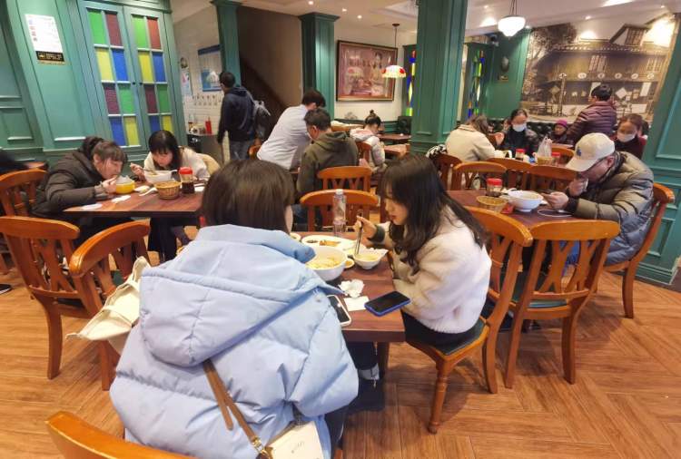 顾客里,有些老人家结伴而来,熟门熟路,满口沪语;有拖家带口的中青年,自己吃一口小笼,喂宝宝一只小馄饨;还有独自前来的刚放学的学生,一边吃美食,一边眼睛锁定在手机屏幕上……
