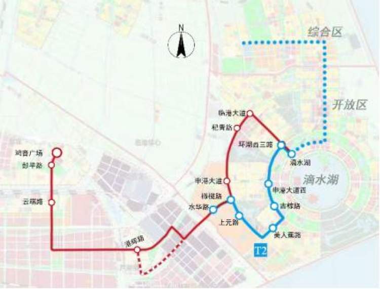T2线工程(近期)位于临港新片区主城区,规划为城市中运量公共交通线路,线路全长8.7km,起讫站点分别位于滴水湖站、水华路站,沿临港大道-环湖西三路-海港大道-沪城环路-橄榄路-水华路,设置9组(其中新建6组10座)车站。T2线工程(近期)计划于2022年1季度贯通运行。