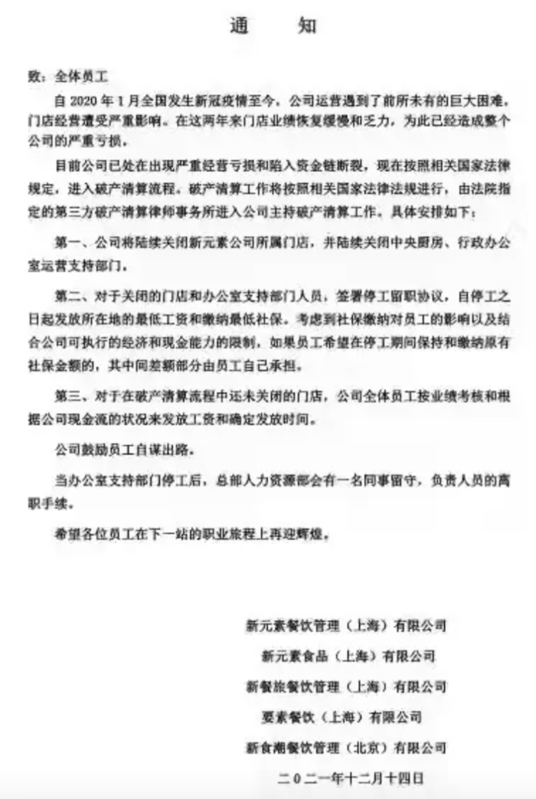 “之后,公司将陆续关闭新元素公司所属门店,并陆续关闭中央厨房,行政办公室运营支持部门。对于在破产清算流程中还未关闭的门店,公司全体员工按业绩考核和根据公司现金流的状况来发放工资和确定发放时间。公司鼓励员工自谋出路。”