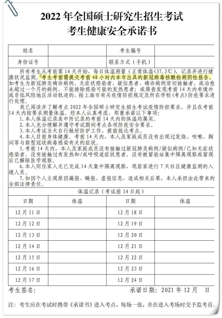 考生须在“上海招考热线”网站重新下载打印新版《2022年全国硕士研究生招生考试考生健康安全承诺书》(见附件),并如实填报。