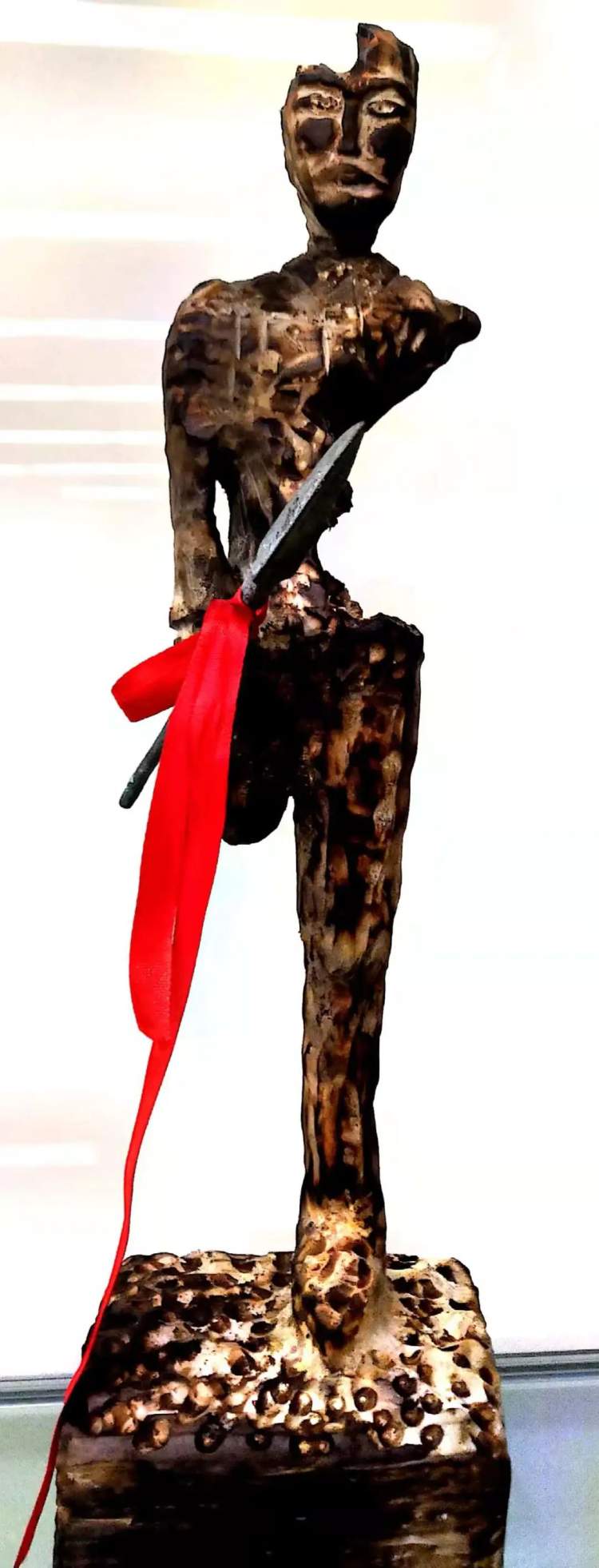 在那个郁闷时期,从小爱雕刻的谭文波创作了一件木雕作品——《“一条腿”奔跑的追梦人》。