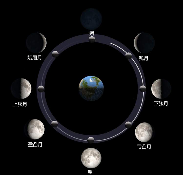 月亮圆缺变化一周称为一个“朔望月”,月亮最圆的那天称为"望",完全看不到月亮的称为"朔"。