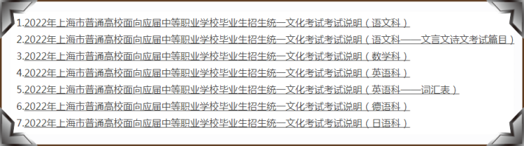 市教育考试院已在“上海招考热线”提供了2022年本市三校生高考的七份资料可供下载,包括语文、英语、德语、日语、数学科目的考试说明,以及语文科目的文言文诗文考试篇目和英语科的词汇表。