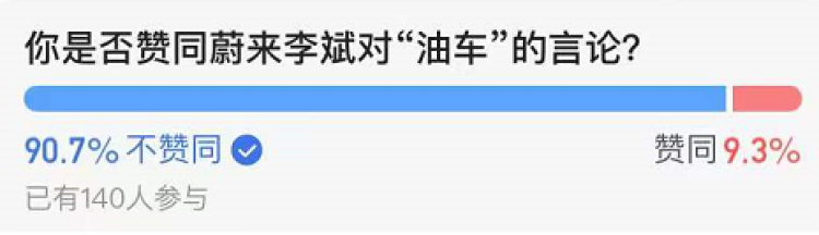 在一项关于你是否赞同蔚来李斌对“油车”的言论的小投票上,有90%以上的网友选择了“不赞同”。