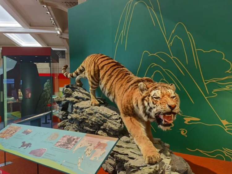 展览分为四个部分。序章以“虎虎生威”开篇,一头来自浙江自然博物院的猛虎标本,开启了关于虎与吉祥文化的讲述。关于虎的展品中,还有清末由安徽移居上海的画家程璋所画《虎啸图》扇页,他画的老虎毛发质感强,比例协调,立体感突出,在国画中糅合了西画技法。