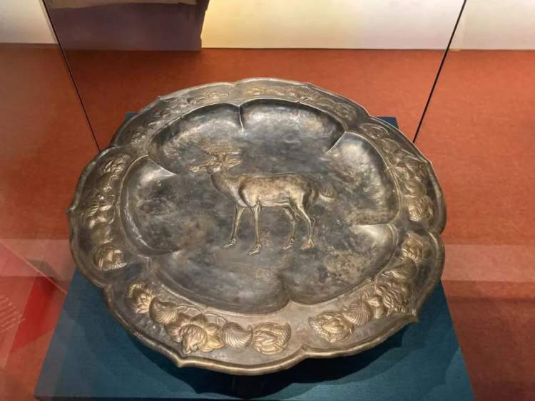 来自河北博物院的唐代“鎏金芝鹿纹三足银盘”器形硕大,带有中亚地区金银器风格,极具盛唐风韵,盘心有一只栩栩如生的梅花鹿,头顶一柄灵芝,四足前后错落。因“鹿”通“禄”,寓意着俸禄和富贵;灵芝则寓意长寿。
