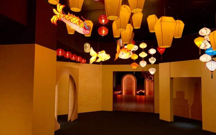 此次的展览空间设计也值得一说。展厅内移步换景,写意场景、氛围场景、投影和镜面空间,让展厅的各个部分都与主题息息相关又自然地起承转合。展厅中处处可见打卡点,比如鱼跃龙门、三羊开泰、福禄寿喜、喜上眉梢、节日灯彩等等。