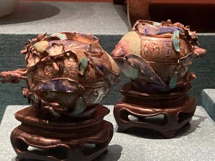 本次展览中可以看到一些很特别的展品。比如清代著名金银匠人“张善六”制作的一对银寿桃。它采用锤鍱、焊接等工艺呈多层圆雕造型,器物表面施蓝、绿、红珐琅彩。主体为桃子模样,外层连缀立体的缠枝花草装饰;沿寿桃中部开合处有一周美术字“寿”,顶面也有一圆形“寿”;寿桃柄部拟形奔跑的梅花鹿。小巧玲珑的寿桃上,福、禄、寿俱全,匠心巧思令人赞叹。