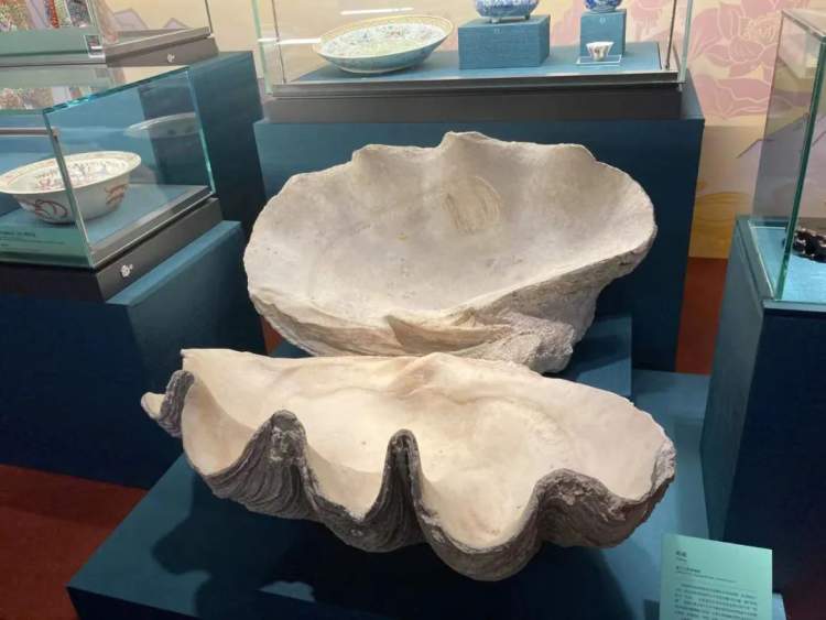国家一级保护动物砗磲也出现在上历博展厅。这件来自浙江自然博物院的砗磲是现存最大的双壳砗磲,重量可达200公斤。砗磲是一种贝壳类动物,因其表面凹凸不平的沟槽好似车辙而被称为“车渠”,后因其石灰质外壳坚如磐石而写作“砗磲”。古代砗磲常被打磨成宝石,而今天,大砗磲已经成为了国家一级保护动物,所以当代人对于传统文化,还应保持理性的扬弃。
