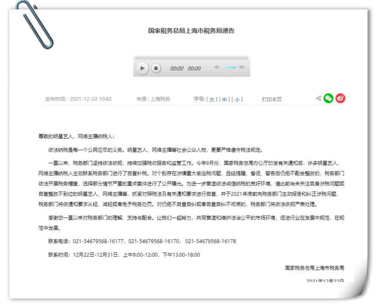 为进一步营造依法诚信纳税的良好环境,请此前尚未关注自身涉税问题或自查整改不到位的明星艺人、网络主播等,抓紧对照税法及有关通知要求进行自查,并于2021年底前向税务部门主动报告和纠正涉税问题,税务部门将依通知要求从轻、减轻或者免予税务处罚。对仍拒不自查自纠或者自查自纠不彻底的,税务部门将依法依规严肃处理。