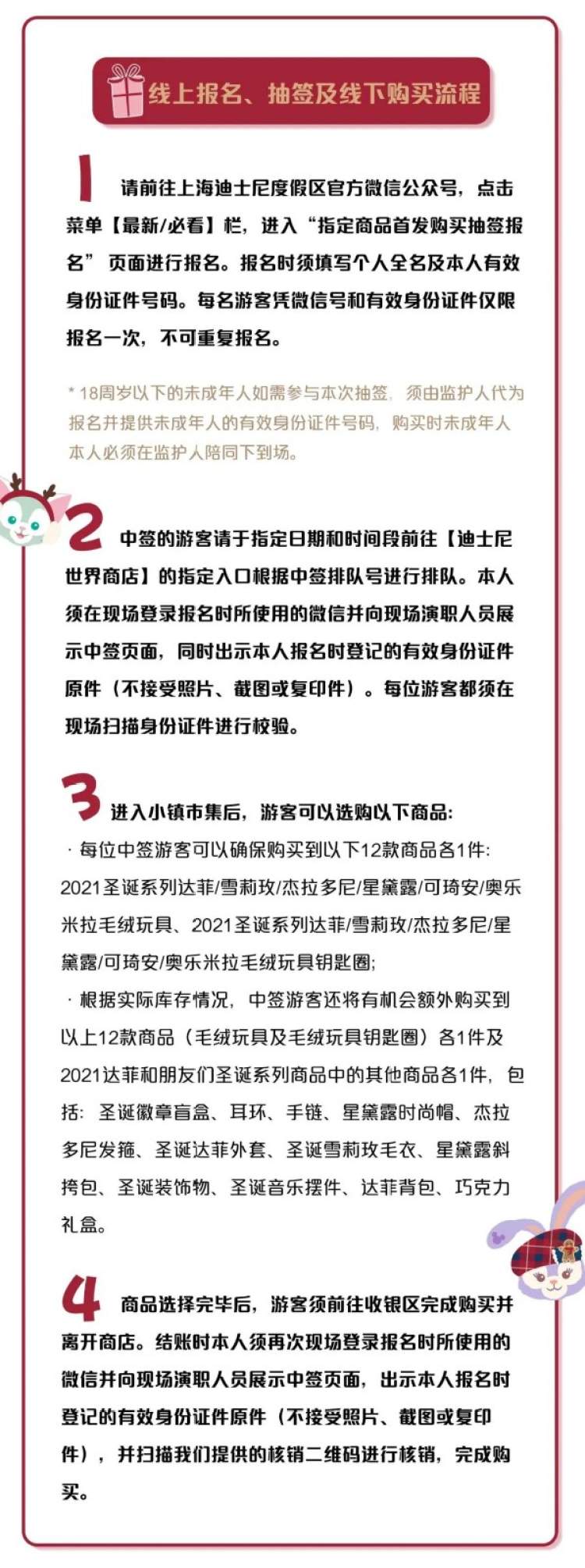 此外,根据实际库存情况,中签游客还将有机会额外购买到以上12款商品(毛绒玩具及毛绒玩具钥匙圈)各1件及2021达菲和朋友们圣诞系列商品中的其他商品各1件,包括:圣诞徽章盲盒、耳环、手链、星黛露时尚帽、杰拉多尼发箍、圣诞达菲外套、圣诞雪莉玫毛衣、星黛露斜挎包、圣诞装饰物、圣诞音乐摆件、达菲背包、巧克力礼盒。