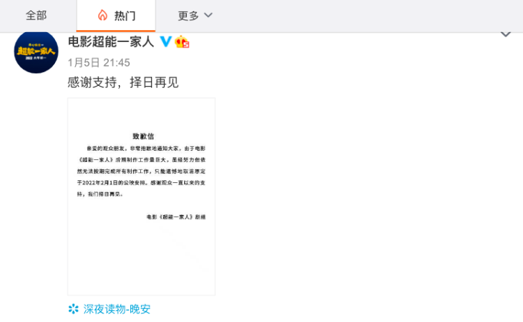 此外,由艾伦、沈腾等主演的电影《超能一家人》也于昨晚宣布撤档。