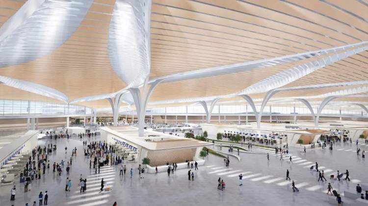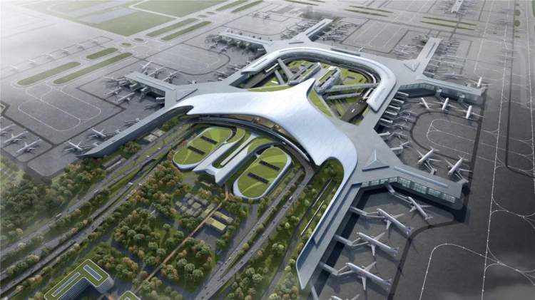 浦东机场四期扩建工程航站区,采用航站楼与交通中心一体化设计,可实现旅客“零换乘”的目标。新建航站楼采用国际、国内双主楼构型,建筑外观象征着新时代“翱翔”寓意,与T1、T2“腾飞”“展翅”的寓意一脉相承。