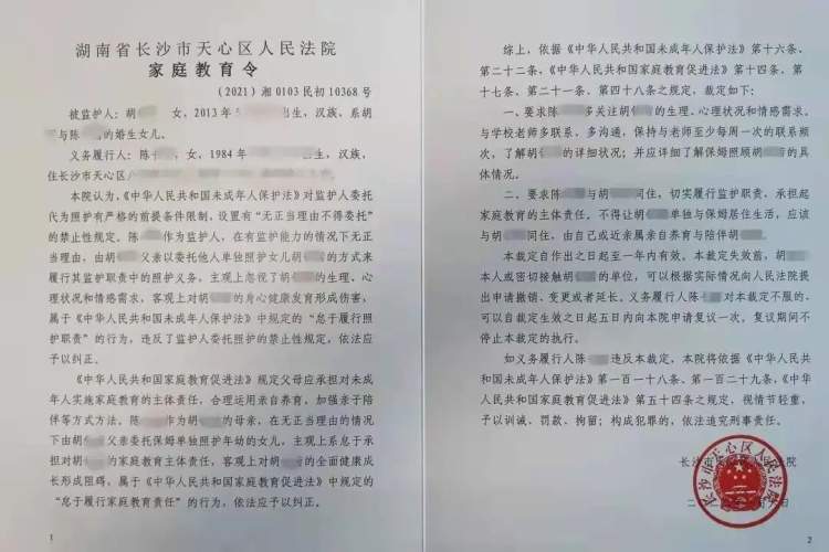 裁定还称,《家庭教育令》有效期一年,在裁定失效前,胡某茜本人或密切接触胡某茜的单位,可以根据实际情况向人民法院提出申请撤销、变更或者延长《家庭教育令》。如义务履行人陈某违反裁定,视情节轻重,予以训诫、罚款、拘留;构成犯罪的,依法追究刑事责任。