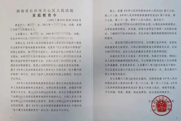 据悉,近年来天心法院少年法庭联合教育部门、团委、妇联等单位始终将保护未成年人合法权益作为工作重点之一,被共青团中央和最高人民法院授予“全国青少年维权岗”荣誉称号。此次发出的《家庭教育令》,系我国家庭教育促进法施行后全国第一例《家庭教育令》,是严格贯彻落实家庭教育促进法的重大探索。该令的出台,是人民法院充分发挥审判职能作用,配合政府及其有关部门建立家庭教育工作联动机制,共同做好家庭教育工作的创新司法实践,有利于依法纠正父母拒绝、怠于履行家庭教育责任,不正确实施家庭教育侵害未成年人合法权益的行为。