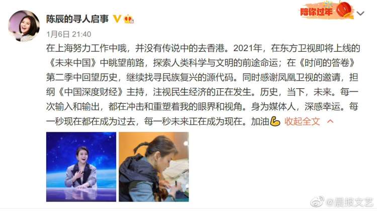 对此,陈辰昨天在微博回应,“在上海努力工作中哦,并没有传说中的去香港。”