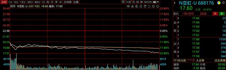 1月7日,A股市场三维天地(301159)、亚虹医药(688176)2只新股上市。其中主营检验检测信息化、数据资产管理等应用软件产品的三维天地收报60.10元,涨幅98.48%;而亚虹医药以20元开盘即破发,至收盘下跌23.41%。开盘价为全天最高价,以盘中最低价17.51计算,投资者中一签最高亏损2735元,成为2022年首只开盘破发的新股。由于这是一家“无营收、无产品”的医药公司,其上市首日是否“破发”也备受业内关注。
