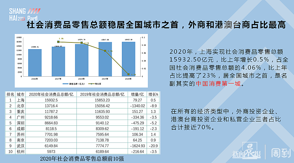 报告显示,2020年,上海实现社会消费品零售总额15932.50亿元,比上年增长0.5%,占全国社会消费品零售总额的4.06%,比上年占比提高了23%,居全国城市之首,是名副其实的中国消费第一城。