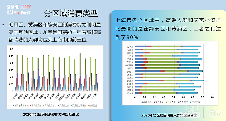 虹口区、黄浦区和静安区的消费能力则明显高于其他区域,尤其是消费能力显著高和高额消费的人群均位列上海市的前三位。