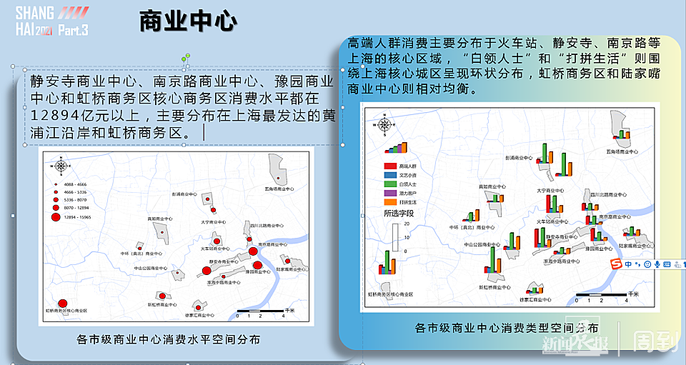 报告显示,排名前三的消费人群中,白领人士占到20%以上,打拼生活类型的消费占15%左右。“白领人士”和“打拼生活”围绕上海核心城区呈现环状分布。